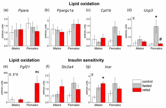 Expression of muscle genes involved in glucose and lipid metabolism in C57Bl/6J mice of three groups: control (fed ad libitum; white color), fasted for 24 h (grey color), and refed for 6 h after 24h-fasting (red color). (a) Ppara, (b) Ppargc1a, (c) Cpt1b, (d) Ucp3, (e) Fgf21, (f) Slc2a4, (g) Insr. mRNA levels of all genes were analyzed by two-way with the factors of “sex” and “experimental group” (control, fasting, refeeding—for all genes, for FGF21—only control and refeeding) with multiple comparisons using post hoc Fisher’s LSD test. Significance was determined as p < 0.05. E, experimental group effect; and E*S, interactive effect of sex and experimental group. * p < 0.05 versus control group, # p< 0.05 versus fasting group, $ p < 0.05 versus males in the same group.