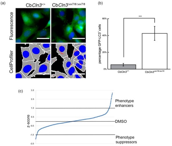 Overview of optimized GFP-LC3 high-content screening assay to monitor the abnormal accumulation of autophagosomes in CbCln3∆ex7/8∆ex7/8 cells. (a) Representative images of the GFP-LC3 signal in wild-type (CbCln3+/+) and CbCln3∆ex7/8∆ex7/8 cells and the masked images from CellProfiler, enabling vesicle and cellular counts in 384-well plates. In masked images, nuclei (blue), cell outline (gray), and GFP-LC3 puncta (red) are each outlined. Scale bars = 40 µm. (b) The relative percentages of GFP-LC3+ cells (defined as cells exhibiting ≥5 GFP-LC3 vesicles) in control wells (DMSO only) for wild-type (CbCln3+/+) and CbCln3∆ex7/8∆ex7/8 cells are shown. Error bars represent standard deviation from the mean. *** p < 0.001. (c) Scatter plot showing the distribution of z-scores for all compounds. “Phenotype enhancers” were those compounds with a z-score of ≥1.5 (data points above line at 1.5 on graph). “Phenotype suppressors” were those compounds with a z-score of ≤−1.5 (data points below line at −1.5 on graph).