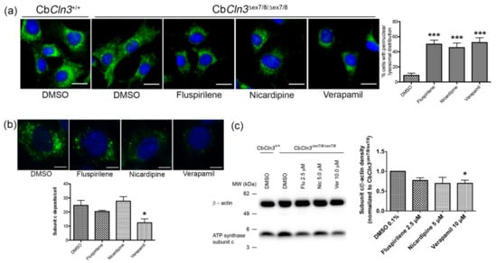 Finally, we evaluated the impact of the three compounds on accumulation of subunit c of the mitochondrial ATPase, which is the main component of the lysosomal storage material in CLN3 disease [,] and which we have previously shown progressively accumulates in CbCln3∆ex7/8/∆ex7/8 cells upon aging []. Following 10-day aging of CbCln3∆ex7/8/∆ex7/8 cells at a confluent plating density, the cells were treated for 24 h with fluspirilene, nicardipine, or verapamil (or DMSO as negative control), prior to fixation and subunit c immunostaining, or to lysate preparation and immunoblot analysis. As shown in Figure 3b,c, a reduction in the number of subunit c deposits per cell was observed following verapamil treatment, while fluspirilene and nicardipine did not show the same degree of reduction in this measure. By immunoblot analysis, again verapamil stimulated a significant reduction in the total subunit c levels from that observed in DMSO control CbCln3∆ex7/8/∆ex7/8 cultures (Figure 3c), while fluspirilene and nicardipine treatment did not lead to a significant reduction in subunit c levels.