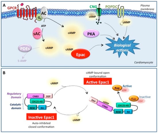3′,5′-Cyclic adenosine monophosphate (cAMP) is a universal second messenger that regulates a multitude of physiological and pathological processes. Synthesis of cAMP from adenosine triphosphate (ATP) is generated by membrane-bound adenylyl cyclases (AC) upon activation of Gs-coupled G protein-coupled receptors [1]. Soluble adenylyl cyclase (sAC) constitutes the second source of cAMP and is activated by bicarbonate and Ca2+ [2]. Intracellular levels and diffusion of cAMP are further regulated through hydrolysis to 5′AMP by a large family of cAMP phosphodiesterases (PDEs) [3]. The biological effects of cAMP are ensured by four main downstream effectors: the protein kinase A (PKA), exchange proteins directly activated by cAMP proteins (Epac), cyclic nucleotide gated (CNG) ion channels, and Popeye domain-containing (POPDC) proteins [4,5,6,7] (Figure 1A). In addition, the molecular scaffolds, A-kinase anchoring proteins (AKAPs) sequester cAMP effectors and PDEs into discrete subcellular compartments to maintain localized pools of cAMP and control therefore the specificity and cellular actions of this second messenger [8]. This compartmentalization permits the differential activation of cAMP effectors. Current evidence indicate that aberrant cAMP signalling through dysregulation of cAMP compartmentalization contributes to pathological cardiac remodelling and heart failure (HF), a major cause of death world-wide [9]. However, the molecular mechanisms by which altered cAMP signalling promotes HF development are not fully understood.