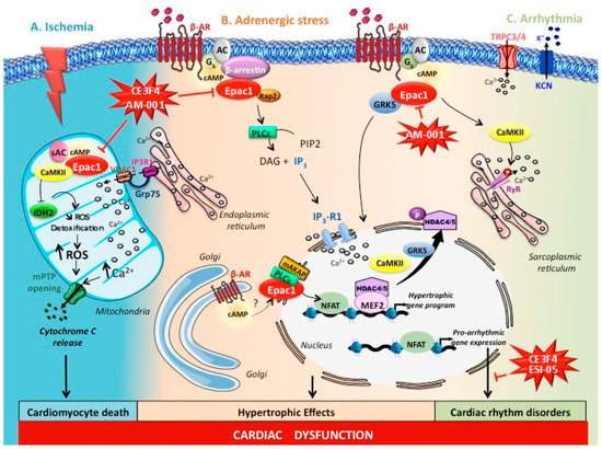 Epac1 signalosome in cardiac stress conditions. (A) Ischemia. In the context of cardiac ischemia, mitochondrial Epac1 is activated by the soluble adenylyl cyclases (sAC) and decreases reactive oxygen species (ROS) detoxification through isocitrate dehydrogenase 2 (IDH2) inhibition. In addition, Epac1 facilitates Ca2+ exchange from the endoplasmic reticulum (ER) to the mitochondrion by enhancing the formation of a Ca2+-handling macromolecular complex composed of voltage-dependent anion channel 1 (VDAC1), the chaperone glucose-regulated protein 75 (GRP75), and the inositol-1,4,5-trisphosphate (IP3) receptor 1 (IP3R1) between the ER and the mitochondrion interface. Epac1-induced Ca2+ overload and ROS accumulation promotes mitochondrial permeability transition pore (mPTP) opening and cardiomyocyte death. (B) Adrenergic stress. Under chronic β-adrenergic receptor (β-AR) stimulation, the β-arrestin/Epac1 complex is recruited at the plasma membrane and activates a Rap2/phospholipase C (PLC)ε pathway to induce 1,4,5-trisphosphate production. This signalling pathway converges to the nucleus to promote nuclear Ca2+ load, Ca2+/calmodulin-dependent protein kinase II (CaMKII) activation, histone deacetylase type 4 (HDAC4) nuclear export and eventually activation of the prohypertrophic transcription factor, myocyte enhancer factor 2 (MEF2). In addition, Epac1 induces G-protein receptor kinase 5 (GRK5) nuclear import and histone deacetylase type 5 (HDAC5) nuclear export to promote MEF2 activity. Yet, Epac1 prohypertrophic signalling includes the phosphatase calcineurin (CaN) and nuclear factor of activated T cells (NFAT). cAMP synthesized at the Golgi by intracellular β-AR may also stimulate the prohypertrophic Epac1/PLCε/A-kinase anchoring protein (mAKAP) signalling at the nuclear membrane of cardiomyocytes. (C) Arrhythmia. Epac1 activation contributes to cardiac rhythm disorders by increasing the expression level of pro-arrhythmic channels (transient receptor potential canonical (TRPC) 3/4 and potassium voltage-gated channel (KCN)). Epac1 also promotes spontaneous diastolic Ca2+ leak via CaMKII-dependent ryanodine receptors (RyR) hyperphosphorylation.