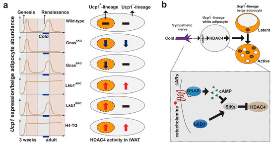 Central role of HDAC4 in white adipocytes during beige adipocyte plasticity. (a) Left: Phenotypes of beige adipocyte genesis and renaissance in mouse models. Right: Blackline, dark-blue down arrow and red up arrow indicate HDAC4 activity in Ucp1+ and Ucp1− lineage adipocytes. (b) Proposed model: Beige adipocyte plasticity, including renaissance and maintenance, is mainly regulated by cAMP- and HDAC4-dependent signaling in Ucp1−-lineage white adipocytes in a non-cell autonomous fashion. Shaded box: Diagram showing salt-inducible kinases (SIKs)–HDAC4 pathway in white adipocytes. Upon cold-stimulation, catecholamine released by sympathetic nerves binds to the beta-adrenergic receptors (βARs) to induce cAMP production by activating adenylate cyclase-stimulating G alpha subunit (GNAS). cAMP inhibits SIKs, leading to dephosphorylation and nucleus-translocation of class IIa HDACs (such as HDAC4). Liver kinase b 1 (LKB1) phosphorylates and activates SIKs, causing phosphorylation and nuclear exclusion of class II HDACs. Abbreviations: Ucp1: Uncoupling protein 1; iWAT: Inguinal white adipose tissue; cAMP: Cyclic adenosine monophosphate; HDAC4: Class IIa histone deacetylase 4.