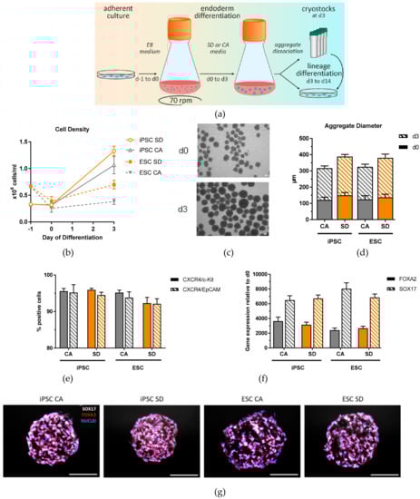 Six days before the start of differentiation, pluripotent stem cells were passaged in flasks at a low density, 1.2 × 104 cells/cm2, using E8 medium and 10 µM Y-27632 (Tocris #1254). Medium was changed every 24 h. At day 3, medium was changed to E8 medium and Supplement 1, supplied in the SD kit (STEMCELL Tech. #05115). On day 1 of differentiation, cells were dissociated with StemPro® Accutase® (Gibco #A1110501) and inoculated in shaker flasks, at a cell density of 3.33 × 105 cells/mL for hiPSCs and 6.67 × 105 cells/mL for hESCs, in E8 medium, E8 supplement (STEMCELL Tech. #05116), and 10 µM Y-27632. For each medium change, the aggregates were collected and centrifuged (Multifuge 3SR+, Thermo) at 300× g for 2 min before placing them in fresh medium. On day 0, medium was changed to STEMDiff™ Endoderm Basal Media containing Supplement MR and CJ. On day 1 and day 2, aggregates were fed with STEMDiff™ Endoderm Basal Media containing Supplement CJ only. On day 3, aggregates were dissociated and analyzed for DE markers, and also further differentiated into liver, pancreatic, intestinal, and lung progenitor cells. Dissociated cells were also frozen in CryoStor® CS10 Freezing Media (BioLife Solutions #210102) at 6 × 106 cells/vial.