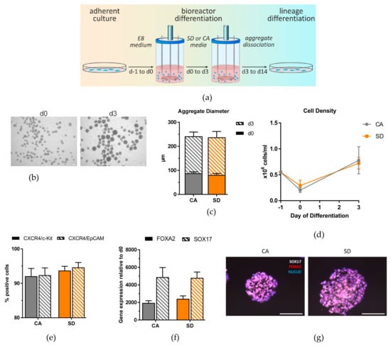 To test further scalability of the DE differentiation protocol established in the Erlenmeyer flask, a 150 mL fully controllable, stirred bioreactor was used to differentiate the hiPSC line towards DE (Figure 4a). The protocol did not need to be adapted or modified to generate aggregates at day 0 (Figure 4b) and to successfully differentiate the aggregates into DE cells, reflecting the robustness of the established method. Aggregates generated in the bioreactor were on average smaller, 88.2 µm for the CA condition, and 81.4 µm for the SD condition, than those generated in the Erlenmeyer flask (Figure 4c). These aggregates followed a similar growth pattern as those in the Erlenmeyer flask, with a cell density of 7.80 × 105 cells/mL for the CA condition and 7.23 × 105 cells/mL for the SD condition by day 3 of differentiation (Figure 4d). In total, an average of 1.12 × 108 DE-cells could be generated in one 150 mL bioreactor. Parameters such as dissolved oxygen (DO) and pH were also monitored during the three days of DE differentiation. DO concentration was different between the two conditions (Supplementary Materials Figure S2a). A spike in DO concentration occurred with every medium exchange, and by day 3 of differentiation, the dissolved oxygen concentration in the SD condition decreased only slightly from 100% to 96%, while in the CA condition, the dissolved oxygen concentration decreased to 38%. The pH of both conditions followed a similar pattern during differentiation, with a spike in pH occurring with every daily medium change. By day 3, the pH slowly decreased to 6.72 and 6.58 in the CA and SD condition, respectively (Supplementary Materials Figure S2b). Flow cytometric analysis of aggregates at day 3 revealed that 92–95% of cells from both conditions were positive for the DE marker combinations CXCR4/c-Kit and CXCR4/EpCAM (Figure 4e). Gene expression analysis and IF staining also confirmed the expression of SOX17 and FOXA2 with homogenous distribution of both markers throughout the aggregates (Figure 4f,g). These results show that DE differentiation in the bioreactor produces a large quantity of DE cells with similar efficiencies as in the Erlenmeyer flask.