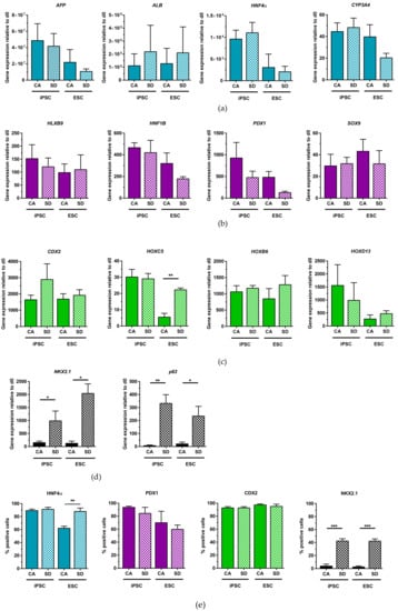 To test lineage potential, DE aggregates were further differentiated towards hepatic-like, pancreatic, intestinal, and lung progenitor cells. Hepatic differentiation was performed using an established protocol []. Gene expression analysis on day 14 showed expression of key hepatic markers (Figure 2a) in both cell lines and conditions. Fetal-related hepatic marker alpha fetal protein (AFP) was expressed in hiPSC-derived hepatic-like cells in comparable amounts under both conditions. In contrast, the hESC-derived hepatic-like cells in the SD condition showed a significantly higher expression of AFP compared to the CA condition. The expression of the adult-related hepatic marker albumin (ALB) in the hiPSC-derived cells in the SD condition was significantly higher than those from the CA condition. Hepatic nucleus factor 4 alpha (HNF4α) expression in hiPSC-derived cells was similar, as was the expression in hESC-derived cells. The most abundant cytochrome P450 complex in the liver, CYP3A4, was expressed in comparable levels between the two conditions in both cell lines. In addition to qRT-PCR analysis, IF staining was performed and positive cells were counted to quantify lineage-specific marker gene expression for differentiated cells (day 7–day 14) as well as undifferentiated cultures (day 1) (Supplementary Materials Figure S3). IF staining revealed that both conditions and cell lines generated cells that were positive for the hepatic markers ALB and HNF4α (Figure 2b). HNFα quantification indicated that both conditions produced similar amounts of HN4α-expressing cells (80–88%). This data suggests that DE aggregates generated from both conditions can differentiate into hepatic-like cells that highly express key hepatic markers.