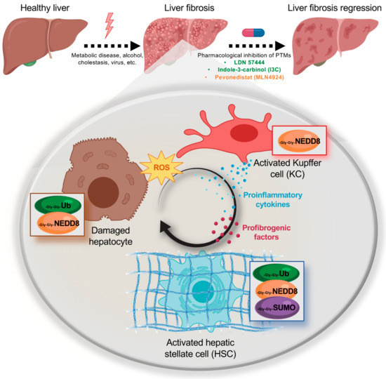 Schematic representation of the post-translational modifications (PTMs) described to date occurring in the main hepatic cell types involved during liver fibrosis, hepatocytes, Kupffer cells (KCs), and hepatic stellate cells (HSCs). Damage causing the transition from a normal healthy liver to a fibrotic liver are also referred, as well as the small-molecule inhibitors of PTMs that have resulted effective in the reversion of liver fibrosis.