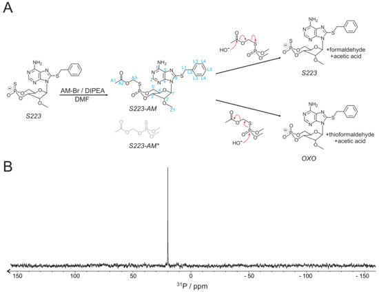 Synthesis of S223-AM. (A) Scheme of synthesis and hydrolysis of S223-AM. The reaction is performed with acetoxymethyl bromide (AM-Br) as a donor of the acetoxymethyl group in the presence of N,N-diisopropylethylamine (DIPEA) in N,N-dimethylformamide (DMF). It results only in the S-linked (S223-AM) but not the O-linked (S223-AM*) version. The postulated mechanisms of hydrolysis resulting in either S223 or OXO are shown. Blue labels, atom identities. (B) 31P-NMR spectrum of S223-AM recorded in DMSO.