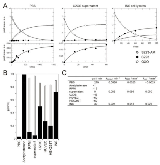 As a model to investigate the conversion process of S223-AM in cells, concentrated lysates of U2OS, HEK293T or INS cells or HUVEC were used (Figure 2). In these lysates S223-AM decayed with half-lives of less than 1 h. The product fraction of OXO varied between about 70% in HUVEC lysates and about 30% in INS cell lysates. Under these conditions, the majority of the product is thus formed by two enzymatic activities, one generating the desired S223 and one generating the undesired OXO.