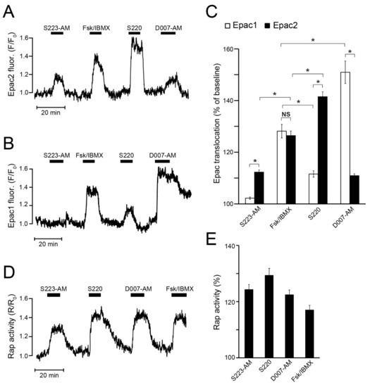 As read-out of endogenous Epac activity, the formation of Rap•GTP was recorded in the MIN6 cells, although this assay does not allow discrimination between Epac1 and Epac2 activity. Since Rap is localised at the plasma membrane, Rap•GTP loading can be monitored by the recruitment of GFP-RalGDSRBD that binds to the GTP- but not GDP-bound form of Rap. The application of S223-AM, S220, or D007-AM all induced immediate and fast Rap activation to a comparable extent, somewhat exceeding the effect of forskolin and IBMX (Figure 4D,E).