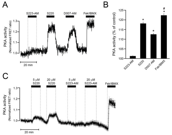 The potential ability of the drugs to activate PKA was investigated by monitoring PKA activity in MIN6 cells using the PM-AKAR3 sensor, which shows increased intramolecular FRET upon phosphorylation by PKA. Whereas 5 µM S223-AM had little effect, 100 μM S220 and 5 μM D007-AM induced marked increases of PKA activity, although not as pronounced as forskolin/IBMX (Figure 5A,B). The difference between S220 and S223-AM was not due to the different extracellular concentrations employed. Accordingly, weak PKA activation was observed already at 5 µM S220, while there was no obvious effect of S223-AM even after increasing the concentration to 20 µM (Figure 5C).