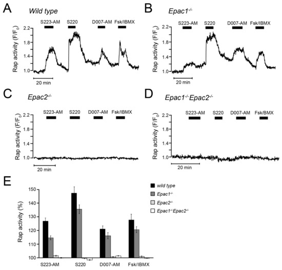 We found that cAMP-stimulated Rap activation at the plasma membrane was completely abolished in pancreatic islet cells from Epac2 knockout mice. This finding indicates that plasma membrane Rap activity is entirely dependent on Epac2, which is in agreement with a low Epac1 expression in β-cells [13,14]. Wildtype and Epac1-deficient cells readily responded to endogenous cAMP elevation as well as to the different cAMP analogues. Unexpectedly, the responses to S223-AM and S220 were somewhat reduced in Epac1-deficient cells. The explanation for this effect is unclear, but it is not likely to reflect an action of these compounds via Epac1, since the responses to 007-AM and cAMP elevation with confirmed effects via Epac1 were unaffected. Moreover, if Epac1 would have contributed to Rap activation, some Rap activity would be expected to remain in the Epac2-deficient cells.