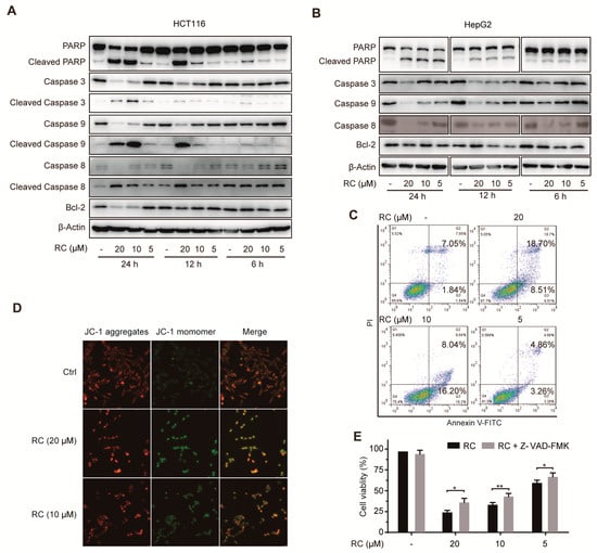 RC induces apoptosis in HCT116 and HepG2 cells. (A,B) RC influenced the expression of apoptosis-related proteins. HCT116 or HepG2 cells were incubated with various concentrations of RC for 24, 12, or 6 h and the expression of apoptosis-related proteins was measured by Western blotting. (C,D) HepG2 cells were incubated with various concentrations of RC for 24 h and the cells were co-stained with Annexin V/PI to determine apoptosis by flow cytometry (C), or stained with JC-1 and photographed by fluorescence (D). (E) HepG2 cells were incubated with or without Z-VAD-FMK (25 μM) for 1 h, and then treated with various concentrations of RC for 24 h. Cell viability was determined by MTS assay. The data are presented as the means ± S.D. from three independent experiments. *, p < 0.05; **, p < 0.01.