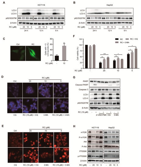 Autophagy is an important catabolic pathway for damaged organelles, lipids and misfolded proteins in cells, and is involved in cell survival and drug resistance. Therefore, we investigated whether RC influenced autophagy by different methods. The lipidation of microtubule-associated protein LC3-I, an autophagy marker, is converted to LC3-II during autophagy. RC significantly increased the expression of LC3-II (Figure 3A,B), which could be further enhanced by chloroquine (CQ) (Figure 3G), a late-stage autophagy inhibitor. Consistently, RC also increased the aggregation of GFP-LC3 dots (Figure 3C). Sequestosome 1 (SQSTM1, p62), a ubiquitin binding protein, is reduced through lysosomal degradation of autophagosomes during autophagy. As shown in Figure 3A,B, RC decreased the expression of p62/SQSTM1 in a dose-dependent manner. In addition, monodansylcadaverine (MDC) staining showed that RC led to an obvious increase of autophagic vesicles with or without treatment with CQ or 3-methyladenine (3-MA, an early-stage autophagy inhibitor) (Figure 3D). Similar results were also observed by lysosomal staining (Figure 3E), which demonstrated that RC increased the amount of lysosome or induced lysosome aggregation. These results support that RC causes autophagy in HCT116 and HepG2 cells.