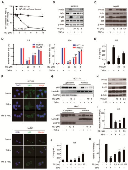 RC inhibits the activation of NF-κB signaling pathway. (A) RC inhibited the NF-κB signaling pathway. HEK293T cells were transfected with the 5× κB-luciferase and pTK-Renilla reporters. Twenty-four hours after transfection, the cells were treated with various concentrations of RC for 6 h, and then incubated with 10 ng/mL TNF-α for 4 h before the luciferase activity assay and MTS assay. (B,C) RC reduced TNF-α-induced IκBα phosphorylation, IκBα degradation and p65 phosphorylation. HCT116 or HepG2 cells were incubated with various concentrations of RC for 24 h and treated with 10 ng/mL TNF-α for 10 min. The cell lysates were prepared and subjected to a Western blotting analysis with the indicated antibodies. (D) RC inhibited TNF-α-induced expression of NF-κB target genes. HCT116 or HepG2 cells were treated with various concentrations of RC for 24 h and stimulated with 10 ng/mL TNF-α for 2 h. The expression of the NF-κB target genes, IL-8 and A20 were measured by quantitative RT-PCR and normalized to GADPH expression. (E) RC inhibited TNF-α-induced IL-8 production. HepG2 cells were treated with RC for 24 h before treatment with 10 ng/mL TNF-α for 4 h. The culture supernatant was collected and subjected to ELISA analysis. (F,G) RC inhibited the TNF-α-induced nuclear translocation of p65. HCT116 or HepG2 cells were incubated with 10 μM RC for 6 h and treated with 10 ng/mL TNF-α for 15 min, and then subjected to an immunocytochemical analysis or a nuclear and cytoplasmic protein extraction analysis. (H,I) RC inhibited LPS-induced IκBα phosphorylation, IκBα degradation, p65 phosphorylation, and IL-6 mRNA expression. RAW264.7 cells were treated with various concentrations of RC for 24 h and treated with 1 μg/mL LPS for 3 h. The proteins and IL-6 mRNA expression were determined. (J,K) RC inhibited LPS-induced IL-6 and NO production. RAW264.7 cells were treated with various concentrations of RC for 24 h and treated with 1 μg/mL LPS for 24 h. The production of IL-6 and NO was measured. The data in (D), (E), and (I–K) are presented as the means ± S.D. from three independent experiments. *, p < 0.05; **, p < 0.01; ***, p < 0.001.