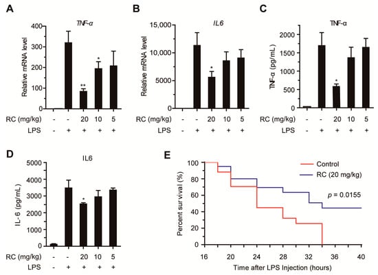 RC prevents endotoxic shock in BALB/c mice. (A–D) RC prevents endotoxic shock in vivo. Mice (n = 6 per group) were intraperitoneally injected with control microemulsion or RC microemulsion for 4 h before intraperitoneal injection of LPS (10 mg/kg). One hour later, the relative levels of TNF-α and IL-6 mRNAs in the liver were evaluated by quantitative RT-PCR (A,B), the serum TNF-α and IL-6 levels were determined by ELISA (C,D). (E) RC improved animal survival. Mice (n = 15 per group) were intravenously injected with control microemulsion or RC microemulsion (20 mg/kg) for 4 h before intraperitoneal injection of LPS (20 mg/kg). Animal survival was recorded in two or four h intervals (p = 0.0155, Mantel-Cox test). The data are presented as the means ± S.D. *, p < 0.05; **, p < 0.01.