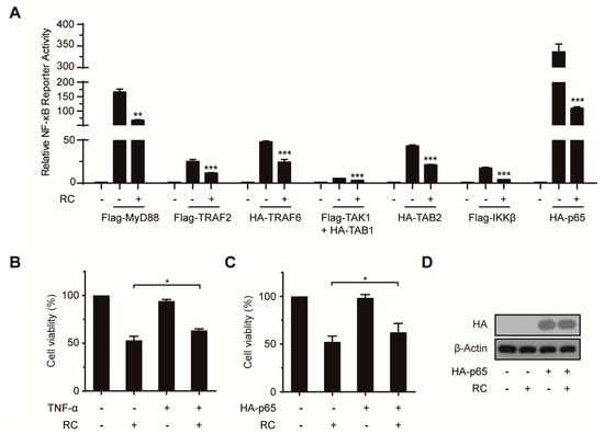 RC represses NF-κB activation upstream of the p65 protein and contributes to cell death. (A) RC inhibits NF-κB activation caused by overexpressing NF-κB-associated key proteins. The indicated plasmids were transfected into HEK293T cells together with the 5× κB-luciferase and pTK-Renilla reporters. Twenty-four hours after transfection, the cells were incubated with 10 μM RC for 6 h before luciferase assays were performed. (B–D) RC induced cell death involving in NF-κB pathway. HepG2 cells were incubated in the presence or absence of TNF-α (20 ng/mL, 30 min) prior to treatment with 5 μM RC for 24 h. The cell viability was evaluated by MTS assay (B). Similarly to (B), cells were transfected with HA-p65 plasmid for 24 h, then incubated with 5 μM RC for 24 h. The cell viability was also evaluated by MTS assay (C,D). *, p < 0.05; **, p < 0.01; ***, p < 0.001.
