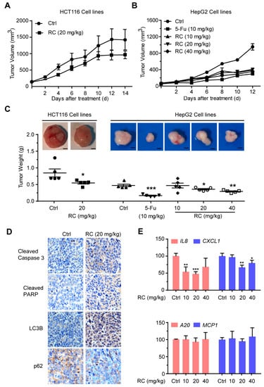 RC inhibits tumor growth and induces apoptosis and autophagy with the inhibition of NF-κB in vivo. (A–C) RC inhibited the growth of HCT116 and HepG2 xenograft tumors. Female athymic nude BALB/c mice bearing HCT116 (n = 5) or HepG2 (n = 5) xenograft tumors were intraperitoneally injected with control microemulsion or RC microemulsion every other day. 5-FU (10 mg/kg) group as positive control. Effects of RC on the growth curves of subcutaneous xenografts (A,B) and on the tumor weight (C) in the HCT116 and HepG2 models. (D) The expression of the apoptosis and autophagy related proteins in HepG2 tumor tissues was evaluated by an immunohistochemistry analysis. (E) The expression of the NF-κB target genes, IL-8, CXCL-1, A20 and MCP-1 in HepG2 tumor tissues was determined by quantitative RT-PCR and normalized to GADPH expression. *, p < 0.05; **, p < 0.01; ***, p < 0.001.
