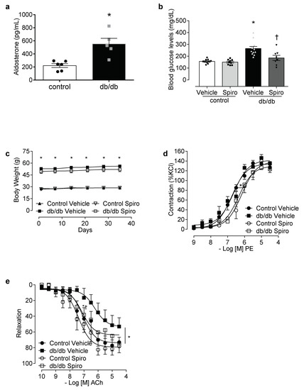 Mineralocorticoid receptors (MR) activation contributes to increased blood glucose levels and vascular dysfunction in diabetes. Aldosterone levels in control and db/db mice (a), plasma glucose levels at 6 weeks of treatment (b), body weight (c), contractile responses to phenylephrine (d) and relaxation to acetylcholine (e) of mesenteric arteries in control and db/db mice treated with a vehicle or spironolactone for 6 weeks. Data represent the mean ± S.E.M (n = 4–12 mice per group). In scatterplot with bar graphs, each symbol corresponds to one animal (a—circle: control vehicle; square: db/db vehicle; b—circle: control vehicle; square: control spironolactone; triangle: db/db vehicle and inverted triangle: db/db spironolactone). Student t-test and two-way ANOVA with Bonferroni post-test, p < 0.05 * db/db vehicle vs. control (a–e); † db/db spironolactone vs. db/db vehicle (b,e). Spiro: Spironolactone, PE: phenylephrine, ACh: acetylcholine.