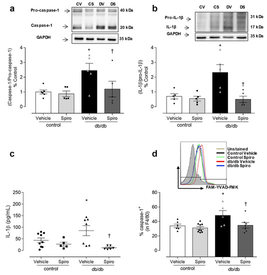 MR activation contributes to inflammasome activation in diabetes. Representative immunoblotting and corresponding graphs depicting vascular expression of caspase-1 (a) and IL-1β (b), determined by Western blot, in mesenteric arteries of control and db/db mice treated with spironolactone or a vehicle for 6 weeks. Plasma levels of the cytokine IL-1β (c), and percentage of caspase-1 activity in macrophages of peritoneal lavage (d), from vehicle- and spironolactone-treated control and db/db mice. These data represent the mean ± S.E.M (n = 5-8 mice per group). In scatterplot with bar graphs, each symbol corresponds to one animal (a–d—circle: control vehicle; square: control spironolactone; triangle db/db vehicle and inverted triangle: db/db spironolactone). Two-way ANOVA with Bonferroni post-test, p < 0.05 * db/db vehicle vs. control (a–d); † db/db spironolactone vs. db/db vehicle (a–d). Spiro: Spironolactone, CV: control vehicle, CS: Control Spironolactone, DV: db/db vehicle, DS: db/db Spironolactone.