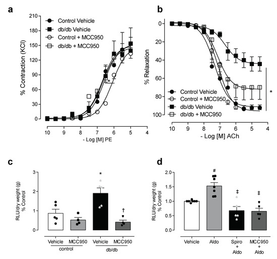 To determine the involvement of NLRP3 in diabetes-associated vascular dysfunction, we used an NLRP3 inhibitor, MCC950. The vascular function of the control and diabetic groups was evaluated in resistance mesenteric arteries, incubated for 1 h with MCC950. No changes in maximal contractile response to PE were observed between the control and diabetic groups in the presence of vehicle or MCC950. However, the presence of MCC950 shifted the potency of the PE response to the right in the control group (Figure 3a, Tables S1 and S2). Endothelium-dependent relaxation induced by ACh, as previously described, was reduced in db/db mice when compared to the control. The use of the NLRP3 inhibitor in vitro partially attenuated the impairment of the vasodilation response in the mice with diabetes (Figure 3b, Tables S1 and S2). Since (i) aldosterone has pro-oxidative and pro-inflammatory effects, (ii) aldosterone-induced ROS generation is linked to vascular dysfunction in diabetes [13,14,18,34,35]; and (iii) ROS are one of the main activators of NLRP3 inflammasome [18,36], we tested the effect of the selective inhibitor of the NLRP3 receptor on ROS generation in mesenteric arteries taken from mice with diabetes, as well as in arteries taken from control mice that were stimulated with aldosterone. The effects of MCC950 on ROS generation in mesenteric arteries of both control and db/db mice were assessed using lucigenin assay. The NLRP3 inhibitor abolished the increased vascular ROS generation in db/db mice (Figure 3c). MCC950 also attenuated aldosterone-induced ROS generation in the mesenteric arteries of the control mice (Figure 3d).