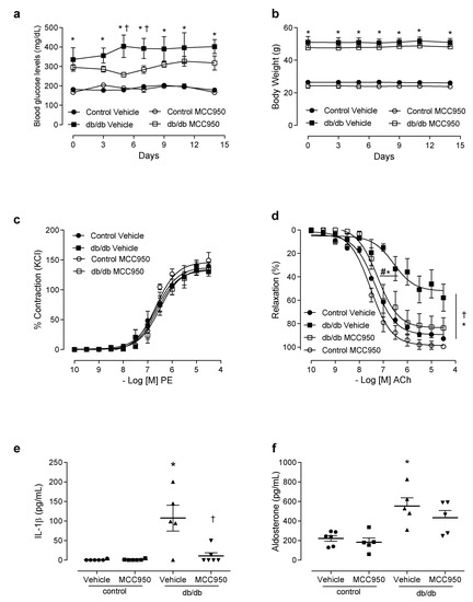 NLRP3 receptor contributes to vascular dysfunction in diabetes. Plasma glucose levels (a), body weight (b), contractile responses of mesenteric arteries to phenylephrine (c) and relaxation responses to acetylcholine (d), plasma levels of IL-1β (e) and aldosterone (f) in control and db/db mice treated with vehicle or MCC950 for 14 days. These data represent the mean ± S.E.M (n = 4–7 mice per group). Two-way/One-way ANOVA with Bonferroni post-test, p < 0.05 * db/db vehicle vs. control vehicle; † db/db MCC950 vs. db/db vehicle. MCC950: NLRP3 inhibitor, PE: phenylephrine, ACh: acetylcholine.