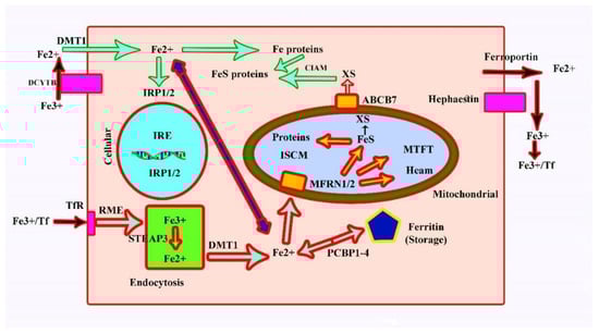 First, the uptake (by endocytotic vesicles) requires the conversion of Fe3+ to Fe2+, which is done by the endosomal ferrireductase STEAP3 followed by DMT1. Mitoferrin 1 (MFRN1; SLC25A37) and mitoferrin 2 (MFRN2; SLC25A28) are required to transport iron into the mitochondria. Mitochondrial Fe2+ has two principal destinies, including synthesis of iron–sulphur clusters and synthesis of haem. Within mitochondria, iron is normally stored as mitochondrial ferritin (MTFT). Cytosolic Fe can be converted into FeS proteins and Fe proteins with the help of the PCB1-4-dependent pathway into ferritin [17,30].
