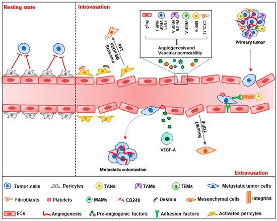 Schematic representation of the metastatic cascade. Inside the primary tumor, tumor cells produce vascular endothelial growth factor (VEGF), and fibroblast growth factor 1 (FGF1) to increase vessel density and interact with endothelial cells via the VEGF and matrix metalloproteinase-1 (MMP-1) signaling pathways to enhance vessel permeability, which provides favorable conditions for tumor metastasis. Endothelial cells (ECs) and pericytes constitute the physical barrier for tumor vessels. Pericytes, in the resting state, suppress tumor intravasation; however, certain populations of activated pericytes and cells undergone pericyte–fibroblast transition (PFT) lose their role as barriers to tumor vessels and facilitate metastasis. Many other cells in the tumor microenvironment, including tumor-associated neutrophils (TANs), tumor associated macrophages (TAMs) and Tie2-expressing macrophages (TEMs), are involved in the pro-metastatic effects, which contribute to angiogenesis and vascular permeability by secreting pro-angiogenic factors, such as VEGF-A, Wnt7B, MMP-9 and C–X–C motif chemokine ligand 12 (CXCL12). During the process of extravasation, tumor cells first adhere to ECs via various adhesion factors. Neutrophils potentiate tumor cell adhesion and transendothelial migration through the integrins/intercellular cell adhesion molecule-1 (ICAM-1) signaling pathway. Endothelial to mesenchymal transition (EndoMT), under transforming growth factor-β (TGF-β) enhances vessel permeability and contributes to the transmigration of metastatic cells. Platelets and metastasis-associated macrophages (MAMs) also enhance extravasation through opening the endothelial barrier. Finally, only a minority of disseminating cells successfully form metastatic foci and colonize in distant organs with the help of angiogenesis. The neovessels provide the necessary oxygen and nutrients for metastatic tumor growth.