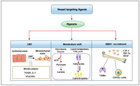 Hypoxia mediates pro-metastatic risk of vessel targeting agents. Hypoxia mediated by vessel targeting agents facilitates tumor epithelial mesenchymal transition (EMT) with decreased expression of epithelial cell markers and enhanced mesenchymal cell markers via the Wnt/β-catenin, transforming growth factor β (TGFβ) and HIV-1 Tat interactive protein 2 (HTATIP2) signaling pathways. Hypoxia contributes to tumor metabolism shift with increased glycolytic metabolism and lipid metabolism by upregulating fatty acid binding protein (FABP3), FABP7 and fatty acid synthase (FASN). Hypoxia also promotes the infiltration of bone marrow derived cells (BMDCs), including tumor associated macrophages (TAMs) and CD11b+ cells through colony-stimulating factor-1 (CSF-1), stromal-derived factor-1α (SDF-1α) and VEGF.