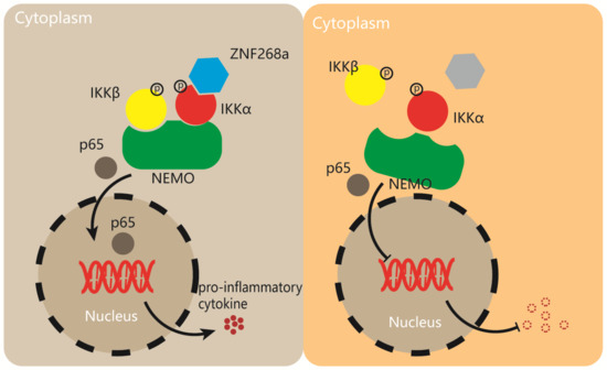 Liu, Y.; Yin, W.; Wang, J.; Lei, Y.; Sun, G.; Li, W.; Huang, Z.; Guo, M. KRAB-Zinc Finger Protein ZNF268a Deficiency Attenuates the Virus-Induced Pro-Inflammatory Response by Preventing IKK Complex Assembly. Cells 2019, 8, 1604. https://doi.org/10.3390/cells8121604
