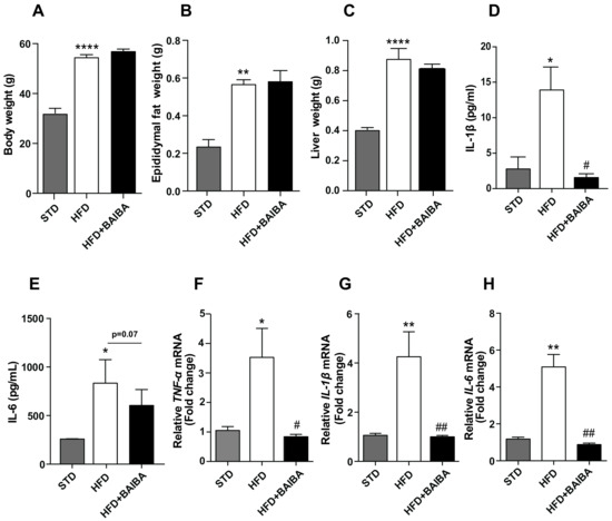 To confirm whether BAIBA has beneficial effects against the hypothalamic inflammation and the metabolic disturbance observed during conditions of chronic over-nutrition, we treated obese mice that were fed a fat-rich diet for 20 weeks with BAIBA for 8 weeks. As shown in Figure 1A, the long-term administration of BAIBA did not alter the body weight, epididymal fat weight, and liver weight in mice fed with the HFD (Figure 1A–C). However, we found that BAIBA treatment effectively reversed the increase in the plasma levels of IL-1β and IL-6 (Figure 1D,E), the pro-inflammatory cytokines, indicating that BAIBA had a reversible effect on inflammatory responses resulting from the long-term consumption of a fat-rich diet. Since hypothalamic inflammation is directly associated with the pathogenesis of obesity [16], we further ascertained whether BAIBA has an impact on the hypothalamic inflammation by evaluating the hypothalamic expression of genes that are involved in the inflammatory responses. The BAIBA treatment significantly ameliorated the increase in the levels of pro-inflammatory genes, including TNF-α, IL1-β, and IL-6 (Figure 1F–H), in the hypothalamus of the HFD-fed mice, compared to the case for the hypothalamus of the STD-fed mice. These findings indicate that BAIBA elicits a beneficial effect on hypothalamic inflammation, acting against late-stage obesity pathogenesis without a reversible impact on obesity phenotypes.