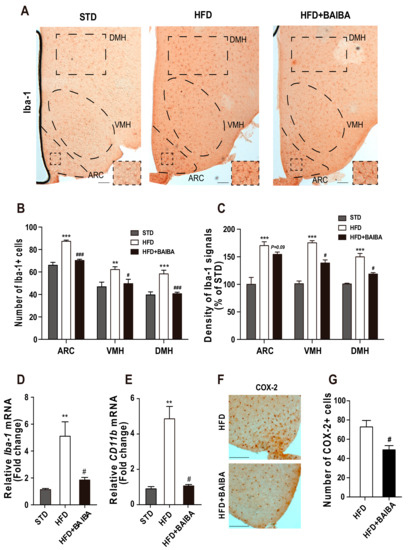 BAIBA ameliorates the microglial activation induced by the long-term consumption of a high-fat diet. The coronal sections of the hypothalamus samples were prepared from mice fed with either a standard diet (STD) or a high-fat diet (HFD) for 20 weeks and then administered orally of BAIBA for 8 weeks. These samples were subjected to IHC analysis using an antibody against the Iba-1 protein, a molecular marker for microglia, for the determination of microglial activation. (A) Representative images showing the IHC staining of Iba-1 in the hypothalamic sections prepared using samples from mice in each group. The increase in the (B) number of microglial cells and (C) intensity of Iba-1 immunoreactive signals observed in the hypothalamus of mice fed with HFD were ameliorated by BAIBA treatment. The increase in the mRNA levels of the (D) Iba-1 and (E) CD11b genes in the hypothalamus of the HFD-treated mice were significantly reversed by treatment with BAIBA. (F) Representative images showing the immunosignals of cyclooxygenase-2 (COX-2) in the hypothalamus samples. The increase in the (G) number of microglial cells retaining COX-2 immunoreactive signals observed in the hypothalamus of the HFD-fed mice was alleviated by the BAIBA treatment. The results are presented as the means ± SEMs. n = 5 for each group. ** p < 0.01, *** p < 0.001 for the HFD-treated group versus the STD-treated group; # p < 0.05, ### p < 0.001 for the HFD + BAIBA-treated group versus the HFD-treated group. Scale bar = 100 μm.