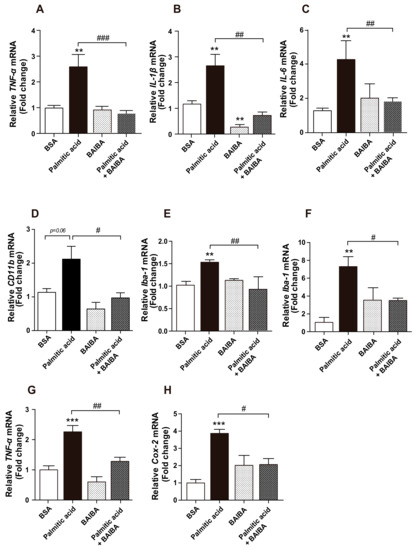 BAIBA ameliorated the palmitic acid-induced inflammation in the microglial cells. The BV-2 cells were seeded at a density of 5 × 105 cells/well and pretreated with BAIBA (100 µM) for 1 h, then, they were treated with palmitic acid (200 µM) for 4 h. The palmitic acid-induced increase of (A) TNF-α, (B) IL-1β, and (C) IL-6 mRNA expression was effectively alleviated by BAIBA treatment in the cultured BV-2 cells, as determined by qRT-PCR analysis. The palmitic acid-induced elevation of the (D) CD11b and (E) Iba-1 mRNA expression levels in cultured BV-2 cells was significantly reversed by the exogenous treatment with BAIBA. Primary microglial cells were seeded at a density of 5 × 105 cells/well, pretreated with palmitic acid (200 µM) for 1 h, then treated with BAIBA (100 µM) for 4 h. The palmitic acid-induced elevations of (F) Iba-1, (G) TNF-α, and (H) Cox-2 mRNA expression were significantly reduced by BAIBA treatment in the cultured hypothalamic primary microglial cells, as determined by qRT-PCR analysis. The results are presented as the means ± SEMs. n = 4 for each group. ** p < 0.01, *** p < 0.001 for the palmitic acid-treated group versus the vehicle-treated group; # p < 0.05, ## p < 0.01, ### p < 0.001 for the palmitic acid + BAIBA-treated group versus the palmitic acid-treated group.