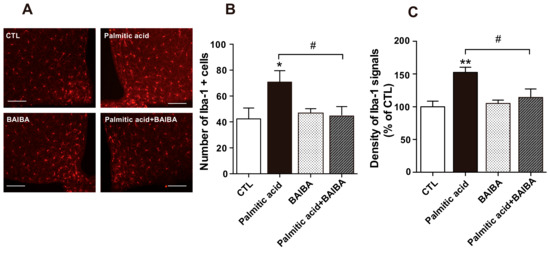 3.4. Systemic Administration of BAIBA Ameliorated the Palmitic Acid-Induced Microglial Activation in the Hypothalamus