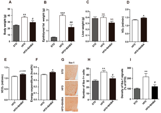 BAIBA effectively alters metabolic phenotypes and reverses hypothalamic microglia activation during the early stage of obesity. C57BL/6 mice fed with either STD or HFD for 8 weeks were treated with BAIBA from 4 weeks after the start of the HFD treatment. The metabolic phenotypes of these mice and the patterns of microglial activation in their hypothalamus were then examined. (A) Body weight and (B) epididymal fat weight gains seen in the HFD-fed mice were effectively attenuated by the treatment with BAIBA. (C) No changes of liver weight were observed in mice from all the groups. (D) Consumption of oxygen, (E) excretion of carbon dioxide, and (F) energy expenditure were elevated by the treatment of the HFD-fed mice with BAIBA. (G) Representative images showing the immunohistochemistry staining of Iba-1 in the hypothalamus sections prepared from the mice in each group. The increase in the (H) number of microglial cells and (I) intensity of Iba-1 immunoreactive signals observed in the hypothalamus of the HFD-fed mice was alleviated by the BAIBA treatment. The results are presented as the means ± SEMs. n = 3–5 for each group. * p < 0.05, ** p < 0.01, *** p < 0.005 for the HFD-treated group versus the STD-treated group; #p < 0.05, ## p < 0.01 for the HFD + BAIBA-treated group versus the HFD-treated group. NS, no significant difference. Scale bar = 100 μm.