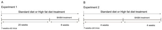 Experiment 1: To examine the effects of BAIBA during the late stage of the development of obesity, the mice were subjected to acclimatization for a week, randomly divided into three groups, and fed either a standard diet (STD, 10% calories from fat, Research Diets Inc., New Brunswick, NJ, USA) or a high-fat diet (HFD, 60% of calories from fat, Research Diets Inc.) for 20 weeks. For BAIBA treatment, the mice were administered with normal drinking water (control group) or drinking water containing 150 mg/kg/day of BAIBA for 8 weeks (Scheme 1A).