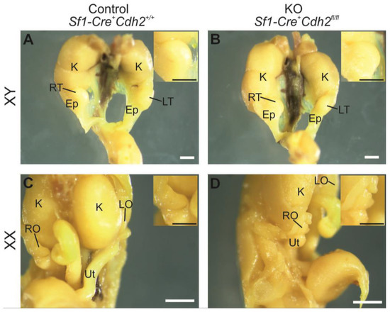 Morphology of the urogenital system of the control male (A), knockout male (B), control female (C), and knockout female (D) at E18.5. Ep—epididymis, K—kidney, LO—left ovary, LT—left testis, RO—right ovary, RT—right testis, Ut—uterus. Insets show magnified gonads. Stage: E18.5, scale bar is equal to 500 μm.