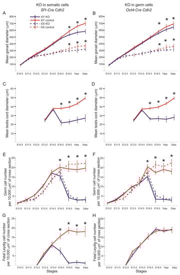Diagrams of gonad size and cell number. (A) The mean of gonad diameter at consecutive stages of development in the Cdh2 knockout in the SF1+ cells. (B) The mean of gonad diameter at consecutive stages of development in the Cdh2 knockout in the OCT4+ cells. (C) The mean of testis cord diameter at consecutive stages of development in the Cdh2 knockout in the SF1+ cells. (D) The mean of testis cord diameter at consecutive stages of development in the Cdh2 knockout in the OCT4+ cells. (E) The number of germ cells in the Cdh2 knockout in the SF1+ cells. (F) The number of germ cells in the Cdh2 knockout in the OCT4+ cells. (G) The number of fetal Leydig cells in the Cdh2 knockout in the SF1+ cells of XY gonads. (H) The number of fetal Leydig cells in the Cdh2 knockout in the OCT4+ cells of XY gonads. * P < 0.05 (by χ2), deviation bars indicate standard deviations.
