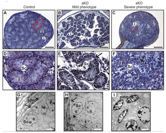 Electron microscopy study showed that the control and mild phenotype had well-defined testis cords (Figure 3G,H) with the germ cells enclosed by a continuous layer of Sertoli cells, well-developed basement membrane, and the peritubular myoid cells (PMCs) surrounding the cords. Testes with the severe phenotype had significant defects in the testis cord architecture. Due to the disruption of the basement membrane, the testis cords were locally “dissolved”, the integrity of Sertoli cell epithelium was disrupted, the Sertoli cells were scattered, and only occasionally the germ cells were present between the impaired cords (Figure 3C,F,I). Electron microscopy analysis revealed that in the severe phenotype, the somatic and germ cells formed disorganized masses of unlayered cells, and the basement membrane was discontinuous (locally absent) (Figure 3I).