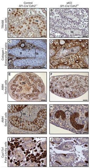 Immunostaining of control and N-cadherin knockout in the somatic cells. (A,B) TRA98 immunostaining shows numerous germ cells in the control testes, and no germ cells in the knockout testis. (C,D) Collagen I immunostaining in control and knockout testis. Regular oval testis cords (ts) are present in the control and irregular, smaller cords are present in the knockout testes. The cords are enclosed by the basement membrane (arrow), Sertoli cells (Sc), germ cells (g). Collagen I-positive interstitium (i) is located between the cords. (E–H) Anti-Müllerian hormone (AMH) immunostaining shows structure of the Sertoli epithelium; (E,G) In the control testes, the Sertoli cells (Sc) have many protrusions, which surround the germ cells (g). (F) The testis cords in the knockout testis have disrupted structure. (H) The testis cords in the knockout testis lack the germ cells—the whole cords are composed exclusively of Sertoli cells (stained). (I,J) Immunostaining for steroidogenesis enzyme—CYP17A1, shows numerous steroidogenic cells (fetal Leydig cells) in the interstitium of the control testis, while only a few CYP17A1 positive cells in the interstitium of the knockout testis (J). Stage: E18.5, scale bar in panels (A–D), (G–J) is equal to 25 μm and in panels (E,F) to100 μm.