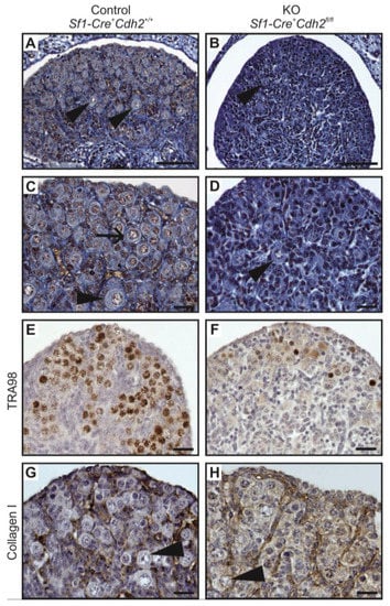 - Piprek, R.P.; Kolasa, M.; Podkowa, D.; Kloc, M.; Kubiak, J.Z. Tissue-specific knockout of E-cadherin (Cdh1) in developing mouse gonads causes germ cells loss. Reproduction 2019, 158, 147–157. [Google Scholar] [CrossRef]
