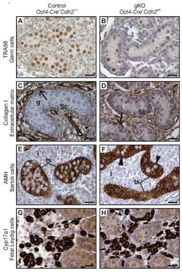 It cannot be excluded that in our experiment the N-cadherin was also deleted in other tissues expressing Sf1, such as the hypothalamus and pituitary gland. Nevertheless, previous studies showed that deletion of gene encoding FSH (follicle-stimulating hormone, produced by the pituitary gland) did not influence gonad structure or the germ cell number, but rather caused the development of gonad tumors [54]. Similarly, a lack of LH (luteinizing hormone, another pituitary hormone) did not influence the development of mouse gonad but was crucial for stimulation of spermatogenesis during maturation [55]. This suggests that the phenotypes observed in our study were effects of N-cadherin deletion in the gonads and not in the hypothalamus or pituitary gland.