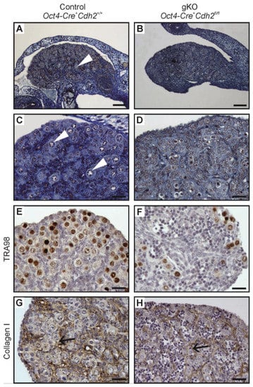 Structure of the ovary of the control and the N-cadherin knockout in the germ cells. Histology (A,C) of the control ovary (Oct4-Cre+ Cdh2+/+) with numerous oocytes (arrowhead). Histology (B,D) of the knockout ovary (Oct4-Cre+ Cdh2fl/fl) lacking the oocytes. (E,F) The TRA98 immunostaining shows numerous germ cells in the control ovaries and a lower number of germ cells in the knockout ovaries. (G,H) Immunostaining for collagen I in the control and knockout ovary shows basement membranes (arrows) outlining the ovigerous cords in both the control and the knockout. Stage: E18.5, scale bar in panels (A,B) is equal to 100 μm and in panels (C–F) to 25 μm.
