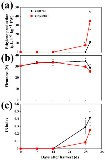 3.1. Ethylene Alleviates IB and Promotes Softening in Peach Fruit