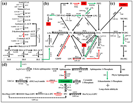 - Chen, M.; Markham, J.E.; Dietrich, J.G.; Jaworski, J.G.; Cahoon, E.B. Sphingolipid long-chain base hydroxylation is important for growth and regulation of sphingolipid content and composition in Arabidopsis. Plant Cell 2008, 20, 1862–1878. [Google Scholar] [CrossRef]