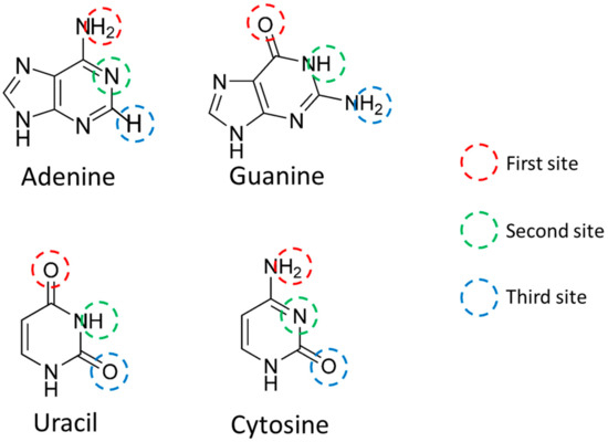 The output file was calculated with Firefly QC package [18], which is partially based on the GAMESS (US) [19] source code, via MoCalc2012. Among the calculation results, MULLIKEN ATOMIC CHARGES of Atoms Used for Hydrogen Bonding (AUHB) of nucleic acids (Figure 1) was used as a vector indicating each nucleobase. When this vector is and the element at the i−th site is , the vector indicating the nucleobase is represented by the following formula (Equation (1)):