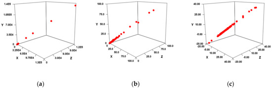 Furthermore, single regression analysis was performed for each method (Table 3). The First element or the x component of was taken as the x-axis, the Second element or the y component of was taken as the y-axis, and the Third element or the z component of was taken as the z-axis. Sum had the lowest correlation compared to other methods.