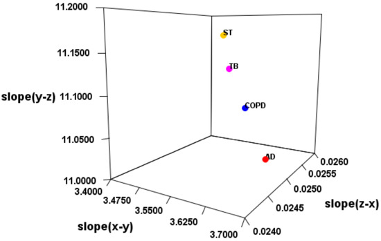When calculated by FC, it was shown that there was a significant difference in slope in all combinations when ±2σ. On the other hand, in the case of log2FC, there was a significant difference in ST and other diseases, but there was no significant difference in other combinations. Based on Table 5, the case where there was a significant difference in all combinations of diseases was marked as ◯, and the case where there was a combination with no significant difference was marked as × (Table 6).