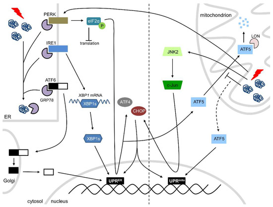 The ER and mitochondrial UPRs. ER stress activates the three arms of the UPRER: PERK, IRE1, and ATF6. PERK activation leads to phosphorylation of eIF2α, resulting in a protein translation block and transcription of ATF4 and CHOP. IRE1 splices XBP1 mRNA and a spliced form translocates to the nucleus. ATF6 is spliced in the Golgi and the N-terminal fragment acts as a transcription factor. All three arms initiate the transcription of ER-related molecular chaperones and/or folding catalysts. Mitochondrial stress activates the UPRmt, which consists of ATF5, PERK, and JNK2. During mitochondrial stress, the import of ATF5 into the mitochondria is blocked, leading to the translocation of ATF5 to the nucleus. PERK activation leads to the transcription of ATF4, CHOP, and ATF5. JNK2 binds to the transcription factor c-Jun, which activates the transcription of CHOP. ATF5, PERK and JNK2 all initiate the transcription of mitochondrial proteases, mitochondrial molecular chaperones, and proteins involved in ROS detoxification and mitochondrial import.