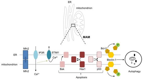 Next to their role in autophagy activation, interactions between the ER and mitochondria can regulate apoptosis under physiological conditions [50]. Bak, known for its localization on the outer mitochondrial membrane where it induces apoptosis upon activation, can also be targeted to the ER, where it depletes Ca2+, induces caspase 12 cleavage, and, subsequently, induces apoptosis (Figure 2) [51]. During the early phase of ER stress, the ER and mitochondria induce an increase in mitochondrial metabolism that depends crucially upon ER–mitochondrial coupling and Ca2+ transfer, which, by enhancing cellular bioenergetics, establishes the metabolic basis for the healthy adaptation to ER stress [39]. In addition, the pro-survival protein HCLS1-associated protein X-1 (Hax1), a novel endogenous inhibitor of apoptosis that is located at both the ER and mitochondria, is associated with maintaining a healthy mitochondrial function and protection from apoptotic cell death (Figure 2). Hax1 is significantly downregulated in cardiac cells upon ER stress, which also resulted in a disrupted mitochondrial morphology, Mfn2 downregulation, and ROS production. Importantly, overexpression of Hax1 protected against ER stress-induced apoptosis and mitochondrial changes, suggesting that Hax1 could be a critical modulator in the cross talk between the ER and mitochondria [52]. The tumor suppressor protein p53 is also an inducer of apoptosis (Figure 2). It can either act indirectly, as a transcription factor increasing or decreasing pro-apoptotic and anti-apoptotic proteins, respectively, or directly, by permeation of the outer mitochondrial membrane through interaction with Bcl-2, thereby releasing cytochrome c from the mitochondria [53,54]. However, p53 is also able to localize to the ER, where it contributes to the imbalance of ER–mitochondrial interactions by inducing mitochondrial damage, including the reduction of oxidative phosphorylation and the release of cytochrome c, leading to apoptotic cell death [55].