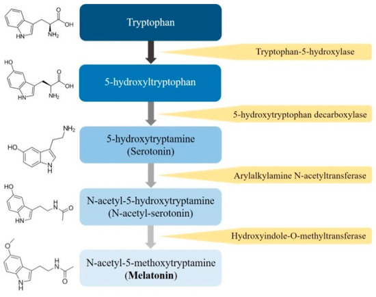 Melatonin (N-acetyl-5-methoxytryptamine), a ubiquitously amphiphilic indole amine, is synthesized from its precursor, tryptophan, and is secreted primarily by the pineal gland and several other organs, including the retina, gastrointestinal tract, bile, skin, bone marrow, and lymphocytes, of humans and mammals [13,14]. In mammals, melatonin synthesis is dependent on the day-night cycle and is part of an intricate enzymatic pathway in which tryptophan is hydroxylated to 5-hydroxytryptophan by tryptophan-5-hydroxylase [15] (Figure 1). Then, 5-hydroxytryptophan is decarboxylated into serotonin by 5-hydroxy-l-tryptophan decarboxylase; afterwards, serotonin is acetylated into N-acetylserotonin, and N-acetylserotonin is subsequently methylated to melatonin, which is quickly released into the bloodstream.